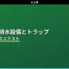 「排水設備とトラップ」の内容から出題するミニテスト第1回(全5問)です。封水深の基準・二重トラップ禁止・破封の原因・管内流速・間接排水をチェックしましょう。