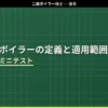 「ボイラーの定義と適用範囲(簡易ボイラー・小型ボイラー・伝熱面積の区分)」の内容から出題するミニテスト第2回(全5問)です。温水ボイラーの基準値・二級ボイラー技士の作業主任者選任範囲・ボイラーに必要な検査・蒸気ボイラーの簡易ボイラー基準・貫流ボイラーの特例の理由など応用的な内容を出題しています。