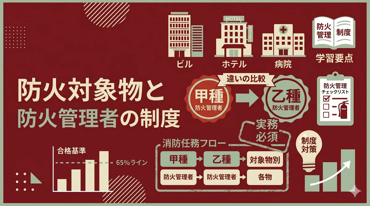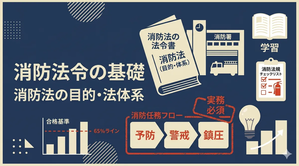 結論:消防法は「火災から人命と財産を守る」ためのルール 防火管理者になるうえで避けて通れないのが消防法の知識です。「法律」と聞くと身構えてしまいますが、実はとてもシンプルな構造をしています。 消防法 「何をすべきか」の大枠火災予防・消火・救助のルール 消防組織法 「誰がやるか」の仕組み消防機関の組織と責任 この2つの法律が消防行政の両輪です。消防法が「ルール」を定め、消防組織法が「組織」を定める。この関係を最初に理解しておくと、講習の内容がスッと頭に入ってきます。 消防法とは ― 目的と概要 消防法の目的 ...
