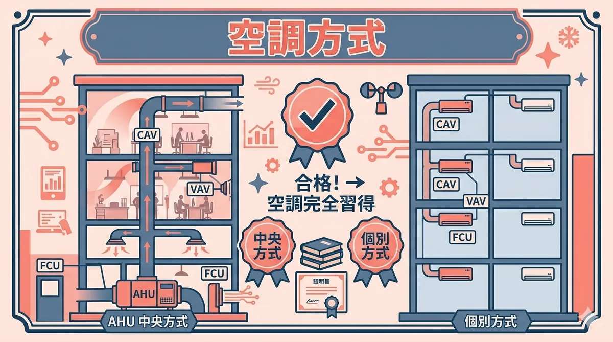 結論:換気はビルの「呼吸」― 汚れた空気を排出して新鮮な空気を取り込む オフィスや商業施設には多くの人がいます。人が呼吸するだけでCO2は増え、酸素は減り、体臭や湿気も溜まっていきます。このまま放置すると頭痛や眠気、さらにはシックビル症候群の原因にもなりかねません。 換気とは、室内の汚れた空気を外に出し、外から新鮮な空気を取り入れること。ビル管理士にとって、「どの方式で」「どれだけの量を」換気すればいいかは最重要知識の一つです。 試験では毎年2〜3問出題され、特に第1種〜第3種換気の違いと必要換気量の計算 ...