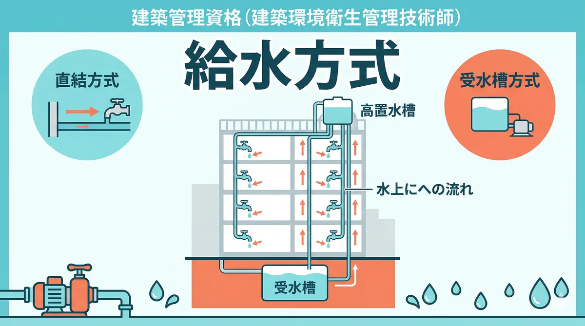結論:給水方式は「建物の規模と用途」で決まる水の届け方 結論から言います。給水方式とは、水道本管から届いた水を建物内の蛇口までどうやって届けるかの「配送方法」です。 戸建て住宅なら水道の圧力だけで蛇口まで届きますが、20階建てのオフィスビルではそうはいきません。上のフロアまで水を押し上げるには、タンクに溜めたりポンプで加圧したりする仕組みが必要です。 建物の高さ・規模・用途に応じて、最適な給水方式は変わります。ビル管理士(建築物環境衛生管理技術者)試験では、各方式の仕組み・メリット・デメリットの比較が頻出 ...