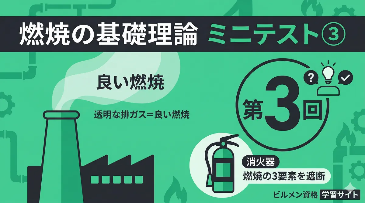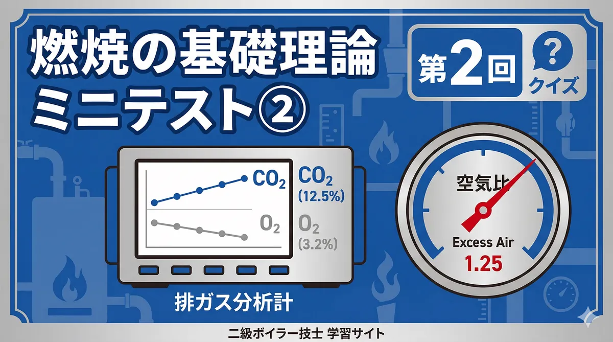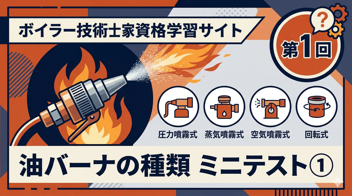 「液体燃料の燃焼方式と油バーナの種類(圧力噴霧式・蒸気噴霧式等)」の内容から出題するミニテスト第1回(全5問)です。霧化の目的・圧力噴霧式バーナの特徴・蒸気噴霧式バーナの特徴・回転式バーナの霧化方法・空気噴霧式バーナの特徴など基本事項を出題しています。 液体燃料の燃焼方式と油バーナ ミニテスト 第1回 第2回 第3回 テストの使い方 まず自分で答えを考えてから「解答を見る」をタップしてください。間違えた問題は解説記事に戻って確認すると効果的です。 第1問 油バーナで燃料油を霧化する主な目的として、正しいも ...