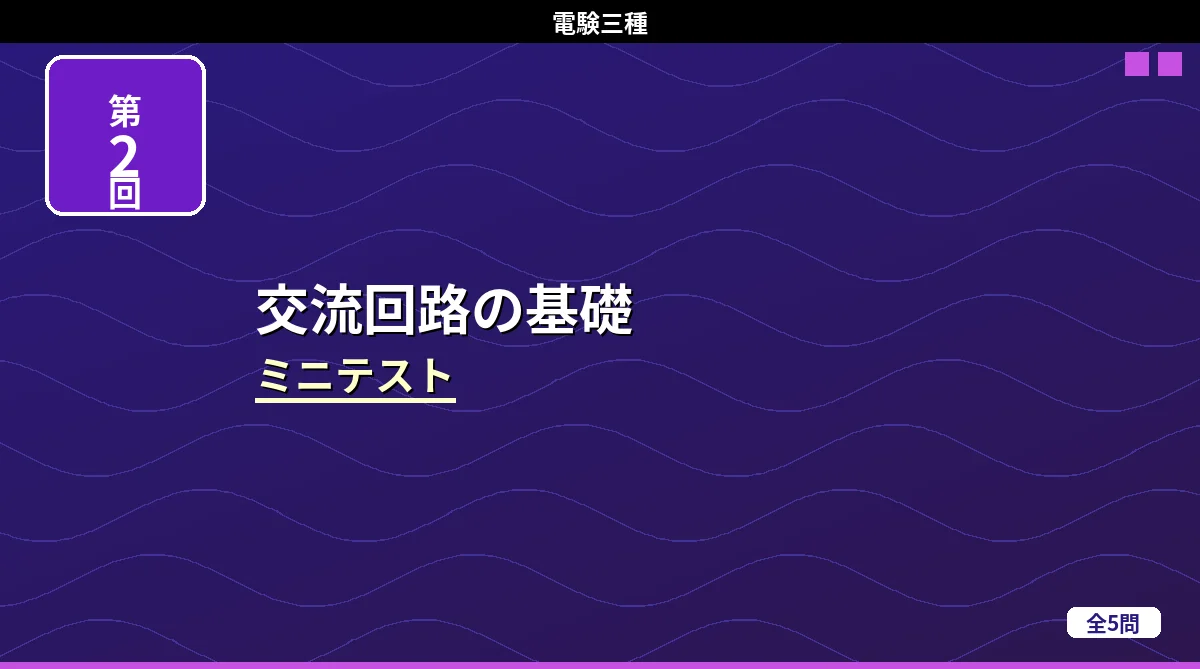 「交流回路の基礎」のミニテスト第2回(全5問)です。 交流回路の基礎 ミニテスト第1回 第2回 第3回 テストの使い方まず自分で答えを考えてから「解答を見る」をタップしてください。間違えた問題は解説記事に戻って確認すると効果的です。 第1問 50Hz の交流の角周波数 [rad/s] に最も近いものはどれか。(1)50(2)100(3)157(4)314(5)628 解答を見る正解:(4)314ω=2πf=2π×50≈314 rad/s 第2問 波形率の定義として正しいものはどれか。(1)最大値/実効値( ...