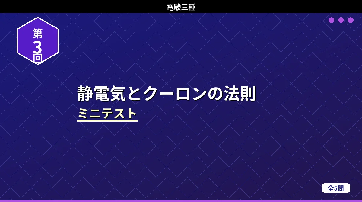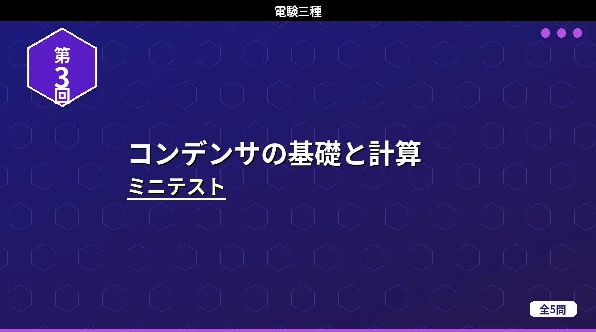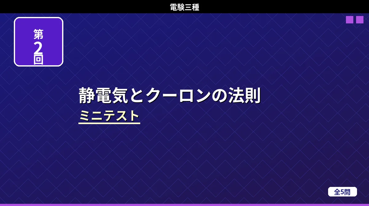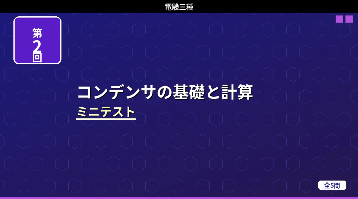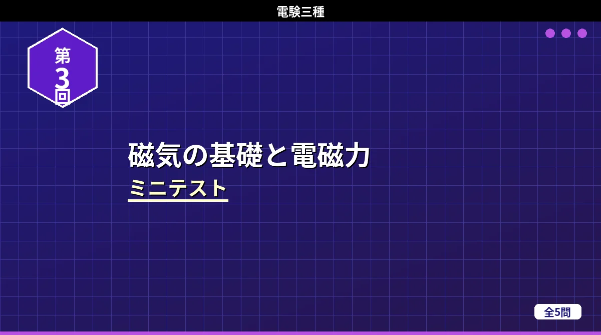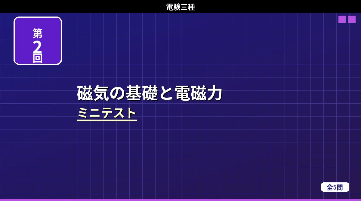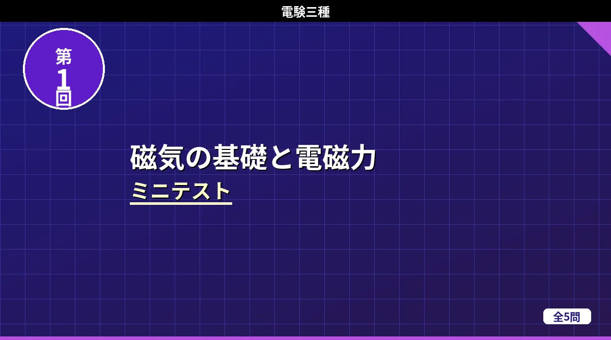 「磁気の基礎と電磁力」のミニテスト第2回(全5問)です。 磁気の基礎と電磁力 ミニテスト第1回 第2回 第3回 テストの使い方まず自分で答えを考えてから「解答を見る」をタップしてください。間違えた問題は解説記事に戻って確認すると効果的です。 第1問 長さ 0.2m の直線導体が磁束密度 0.8T の一様な磁界中を速度 5m/s で磁界に垂直に動いた。誘導起電力 [V] はいくらか。(1)0.2(2)0.4(3)0.8(4)1.0(5)4.0 解答を見る正解:(3)0.8e=BLv=0.8×0.2×5=0. ...