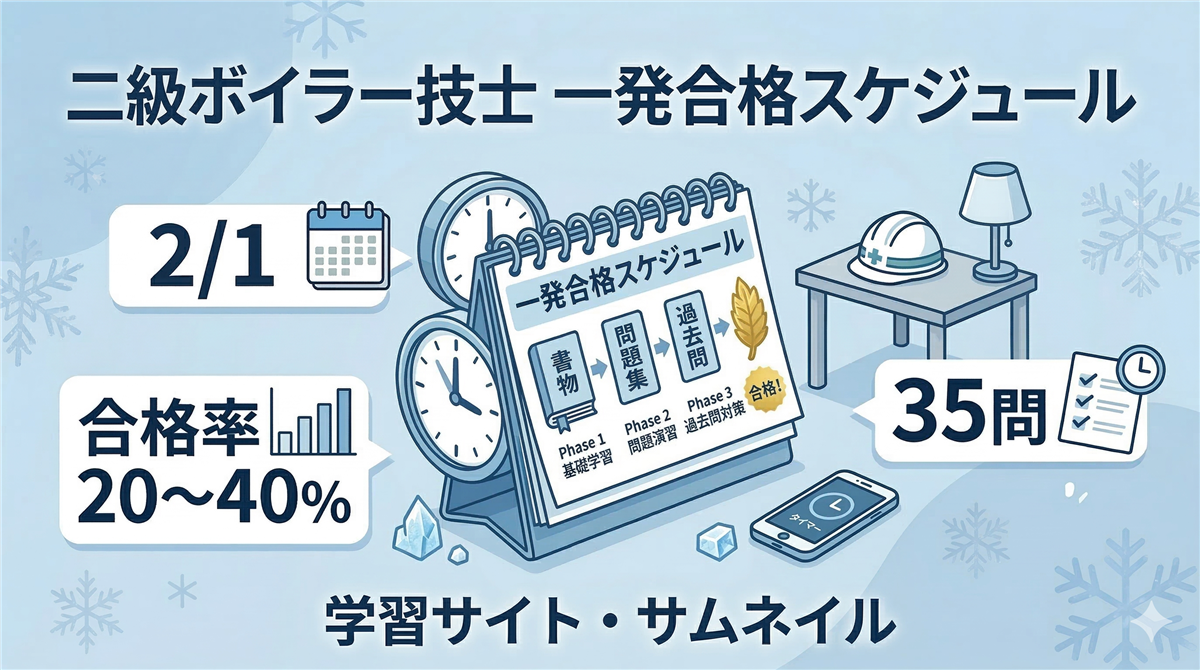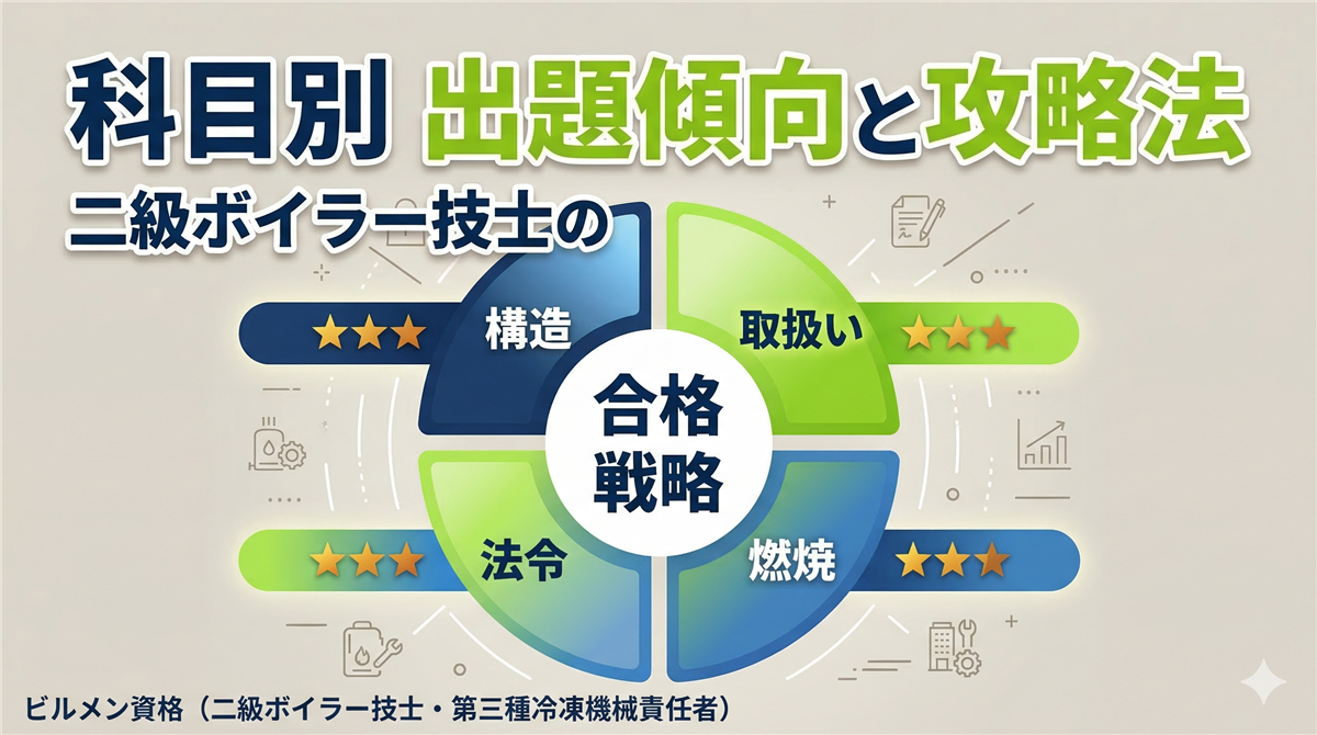 結論:科目ごとの特徴を知れば、効率的に合格できる 二級ボイラー技士の試験は、科目ごとに出題パターンが大きく異なります。各科目の特徴と頻出テーマを押さえておけば、ムダのない効率的な勉強ができます。 この記事では、4科目それぞれの出題傾向と攻略のコツを解説します。「どこを重点的に勉強すればいいかわからない」という方は、ぜひ参考にしてください。 合格のための大原則 苦手科目をゼロにすること。合格基準は「各科目40%以上 + 全体60%以上」。得意科目で稼いでも、1科目でも40%を切ればアウトです。全科目をまんべ ...
