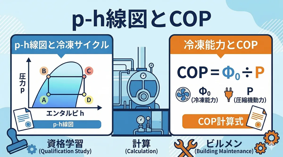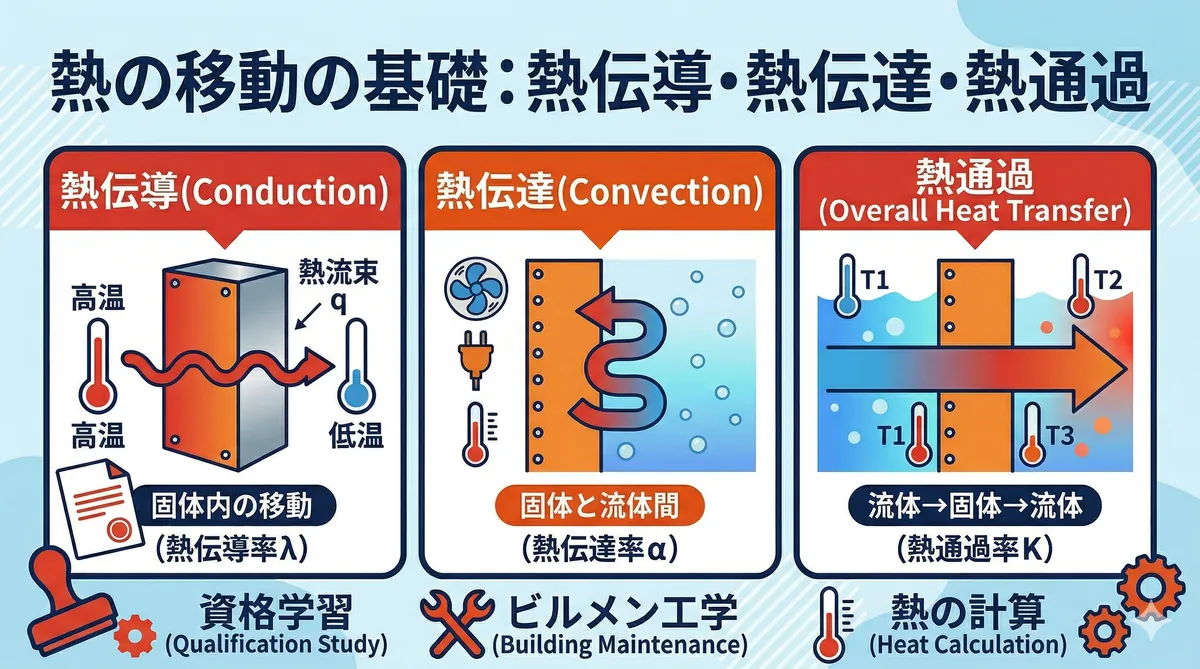 冷凍機の性能は「熱の移動」で決まる 冷凍機の仕事は「熱を低温側から高温側に移動させる」こと。この熱の移動がスムーズに行われるかどうかが、冷凍機の性能を左右します。 この記事では、熱が物質の中や表面をどうやって移動するかの基本を学びます。凝縮器や蒸発器の設計に直結する内容で、試験でもよく出題されます。 熱の移動 ─ 押さえるべき4つの用語 ① 熱伝導(ねつでんどう):固体の中を熱が伝わること ② 熱伝達(ねつでんたつ):固体の表面と流体(液体・気体)の間で熱がやりとりされること ③ 熱通過(ねつつうか):流 ...