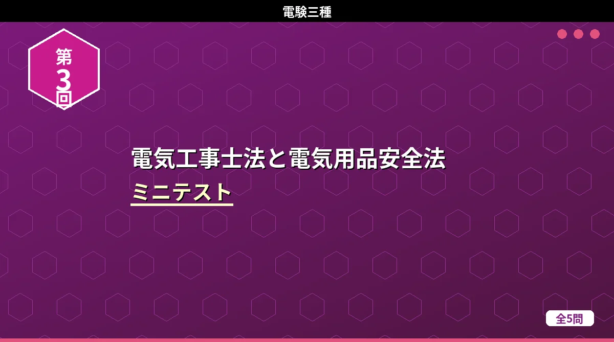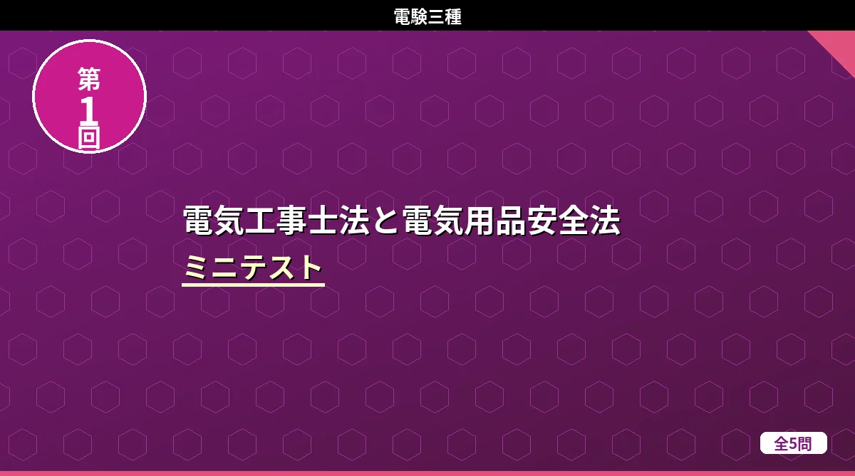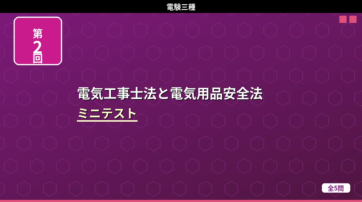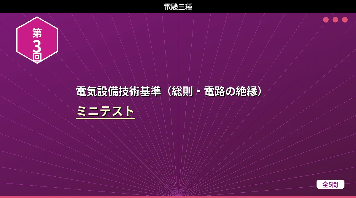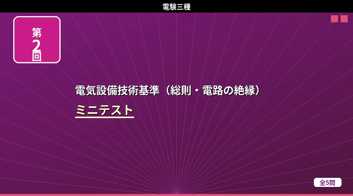 「電気設備技術基準(架空・地中電線路)」のミニテスト第1回(全5問)です。 電気設備技術基準(架空・地中電線路) ミニテスト 第1回 第2回 第3回 テストの使い方 まず自分で答えを考えてから「解答を見る」をタップしてください。間違えた問題は解説記事に戻って確認すると効果的です。 第1問 低圧架空電線が道路を横断する場合の地上からの最低高さはどれか。 (1)3m(2)4m(3)5m(4)6m(5)7m 解答を見る 正解:(3)5m低圧の道路横断は5m以上です。高圧の場合は6m。「低圧は高圧より1m低い」と ...
