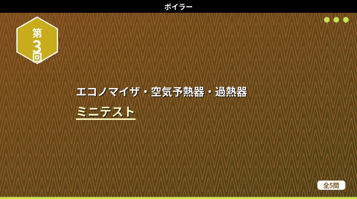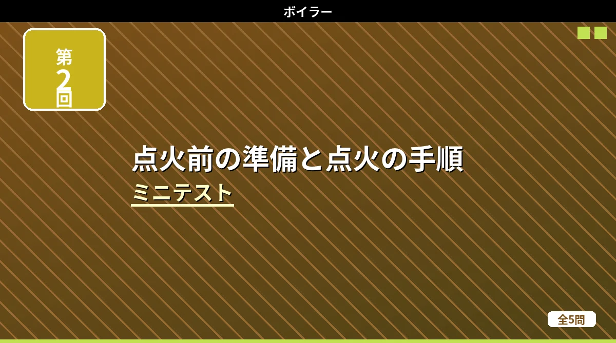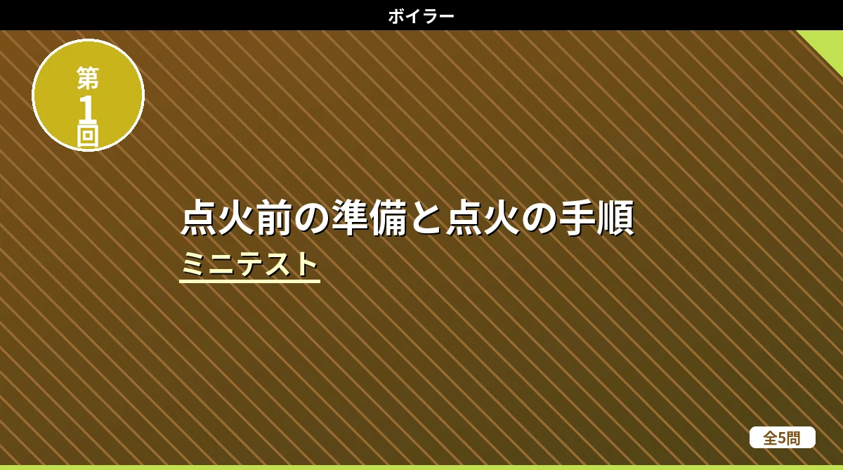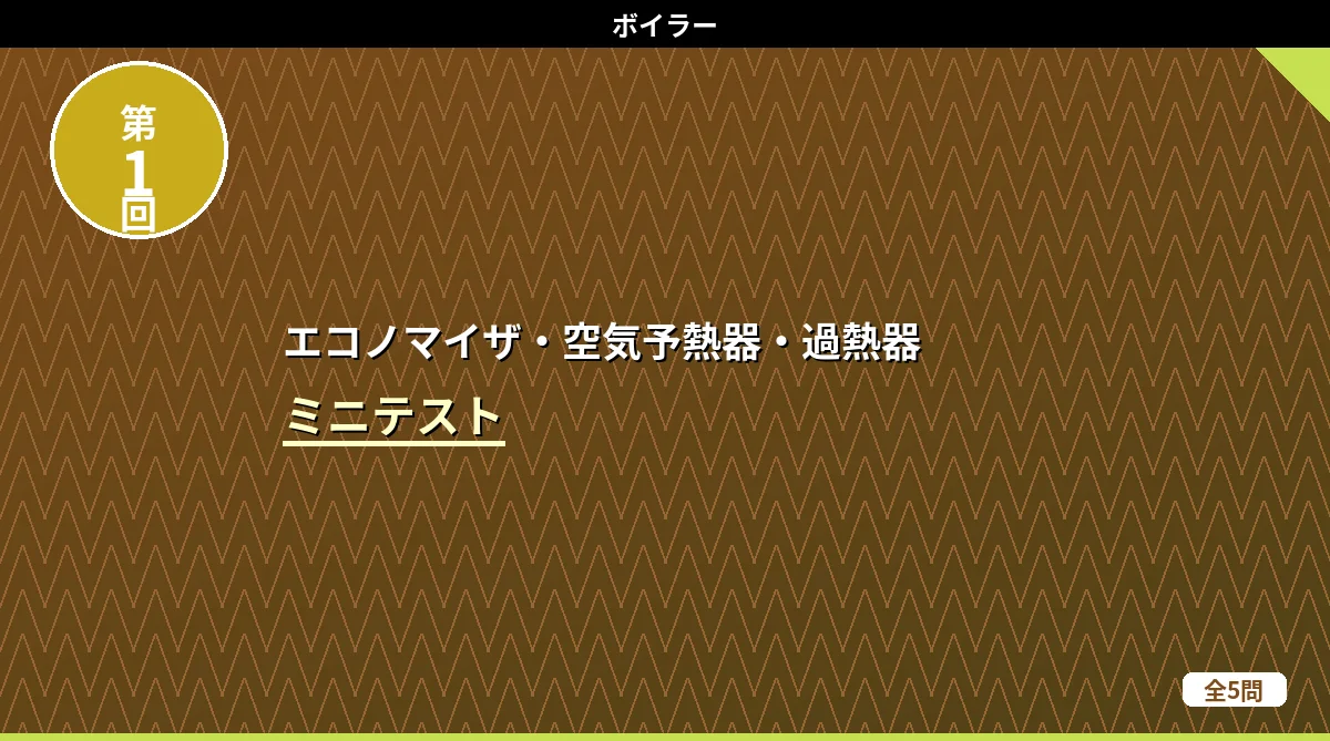「点火前の準備と点火の手順(油だき・ガスだき)」の内容から出題するミニテスト第2回(全5問)です。圧力計の点火前確認・主蒸気弁の状態・重油の予熱・水面計の機能試験・点火失敗時の対処など、第1回より踏み込んだ内容を確認しましょう。 点火前の準備と点火の手順 ミニテスト第1回 第2回 第3回 テストの使い方 まず自分で答えを考えてから「解答を見る」をタップしてください。間違えた問題は解説記事に戻って確認すると効果的です。 第1問 点火前に圧力計を確認するとき、指針はどこを指しているべきか。 (1)最高使用圧力 ...