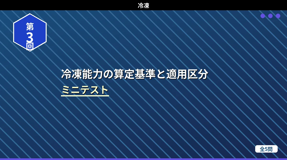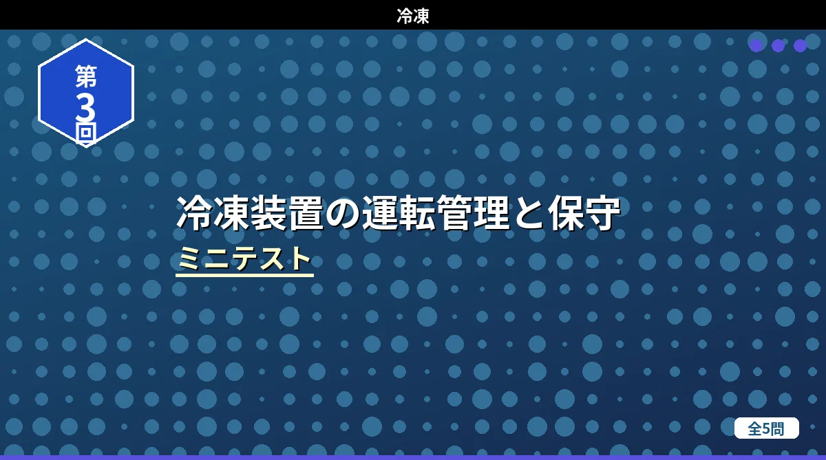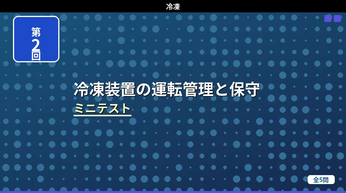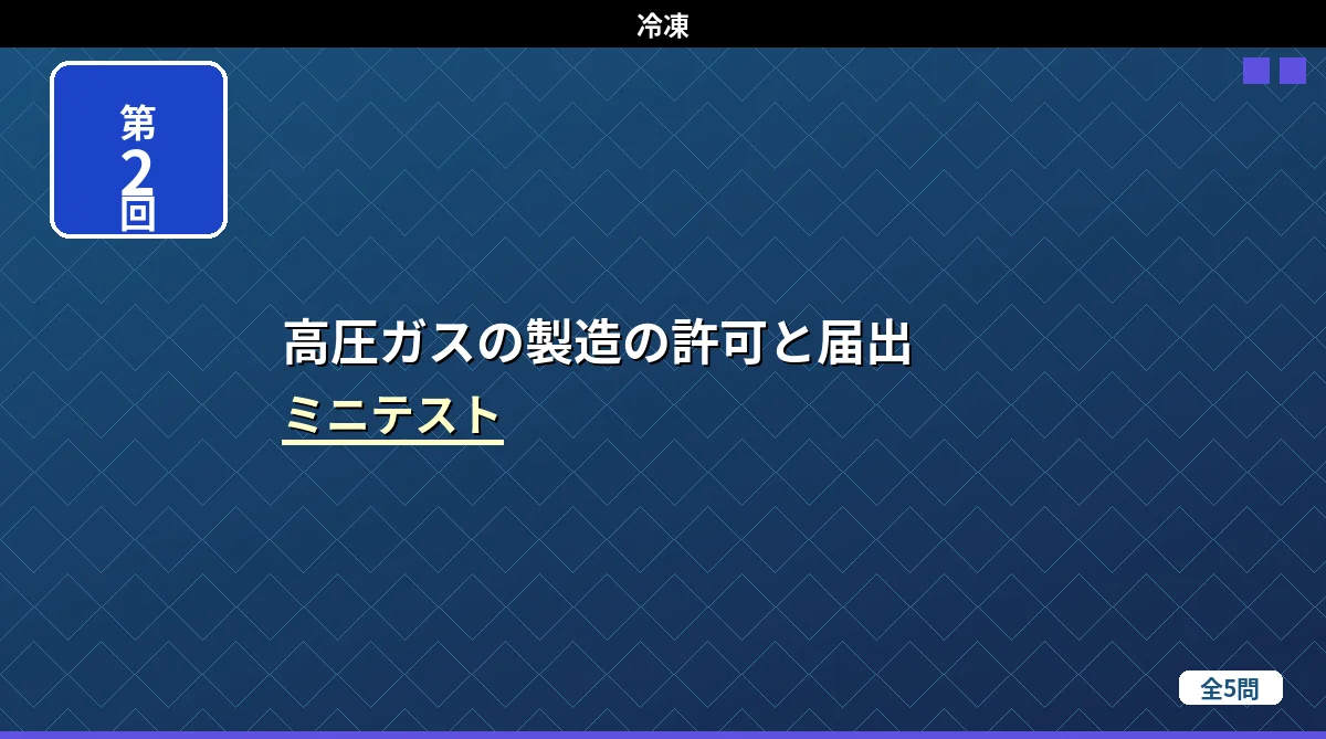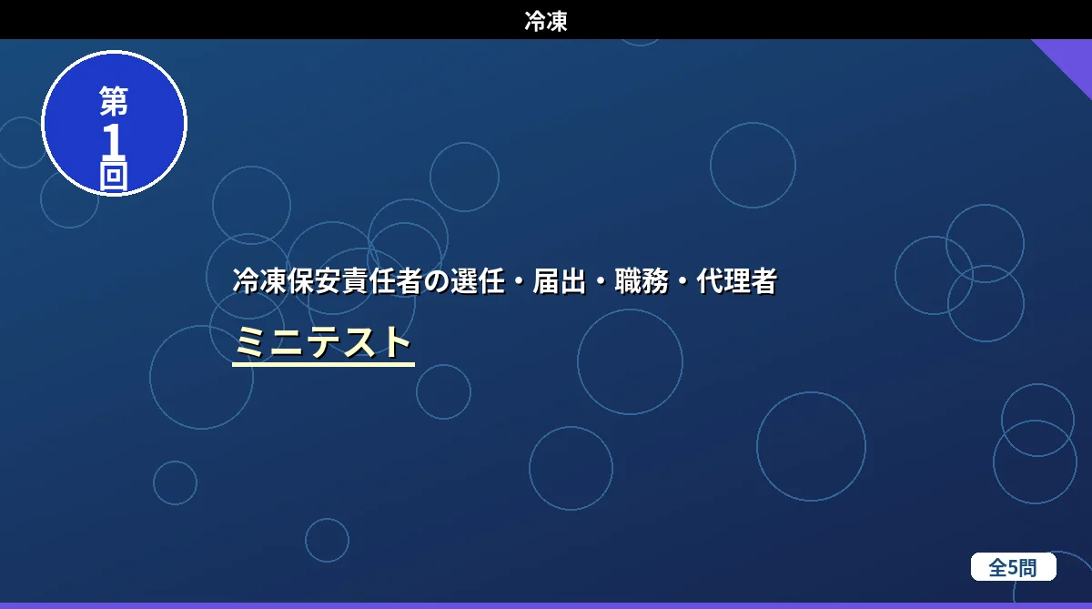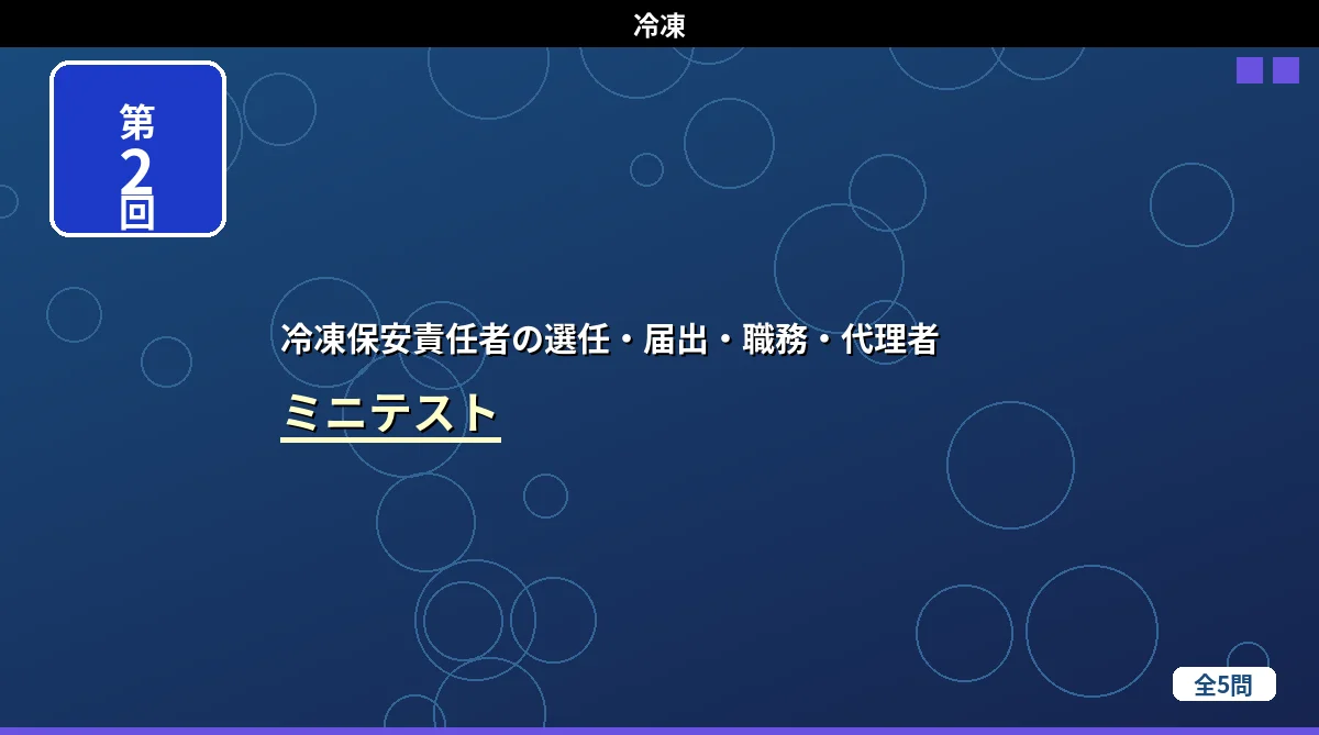 「冷凍保安責任者の選任・届出・職務・代理者」の内容から出題するミニテスト第2回(全5問)です。第二種製造者との比較・免状範囲の応用・保安責任者の職務・届出手続きなど、第1回とは違う角度から出題しています。 冷凍保安責任者の選任・届出・職務・代理者 ミニテスト第1回 第2回 第3回 テストの使い方 まず自分で答えを考えてから「解答を見る」をタップしてください。間違えた問題は解説記事に戻って確認すると効果的です。 第1問 第二種製造者における冷凍保安責任者の選任に関する記述として、正しいものはどれか。 (1) ...